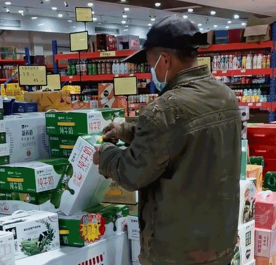 老人已经在出售牛奶的货架区