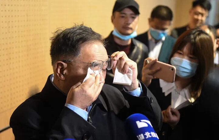 2021年4月9日,张伯礼院士(左一)在武汉江夏方舱医院回忆疫情期间在此奋斗的经历时落泪。新华社记者程敏摄