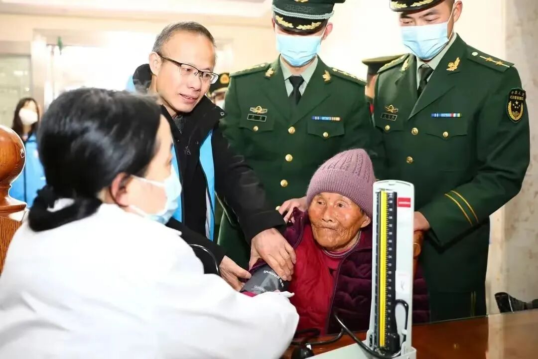 战士们带老人检查身体