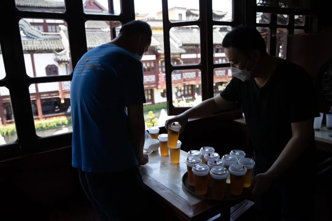 5月31日,在上海黄浦区豫园商城,湖心亭茶楼工作人员在准备外带的冷泡茶。新华社记者 金立旺 摄