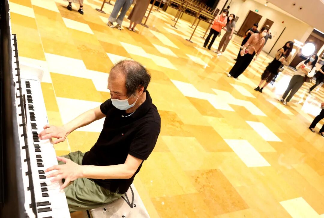 6月1日,74岁的上海市民黄为民在上海兴业太古汇商场弹奏钢琴。新华社记者 陈飞 摄