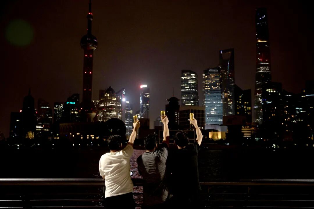 6月1日凌晨,市民在外滩举“杯”。新华社记者 金立旺 摄