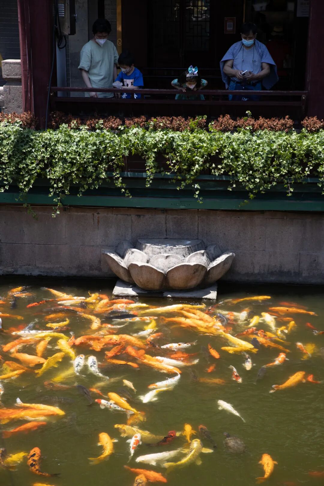 5月31日,在上海黄浦区豫园商城,两名小孩在喂食观赏鱼。