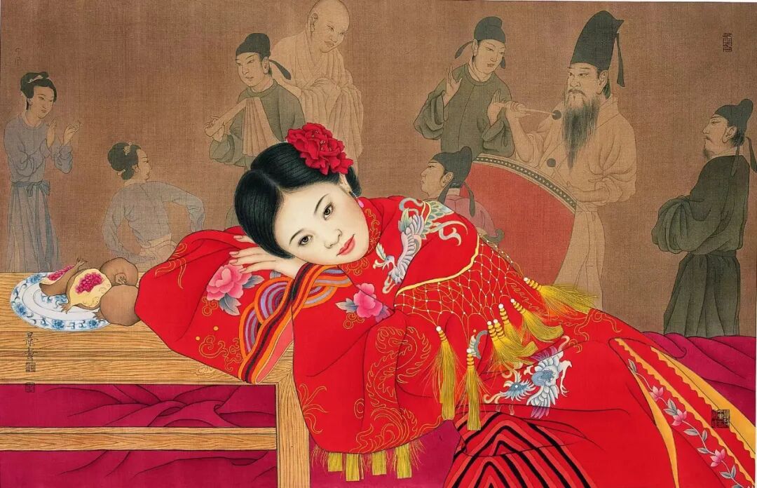 人物的衣饰都以大红为主色调