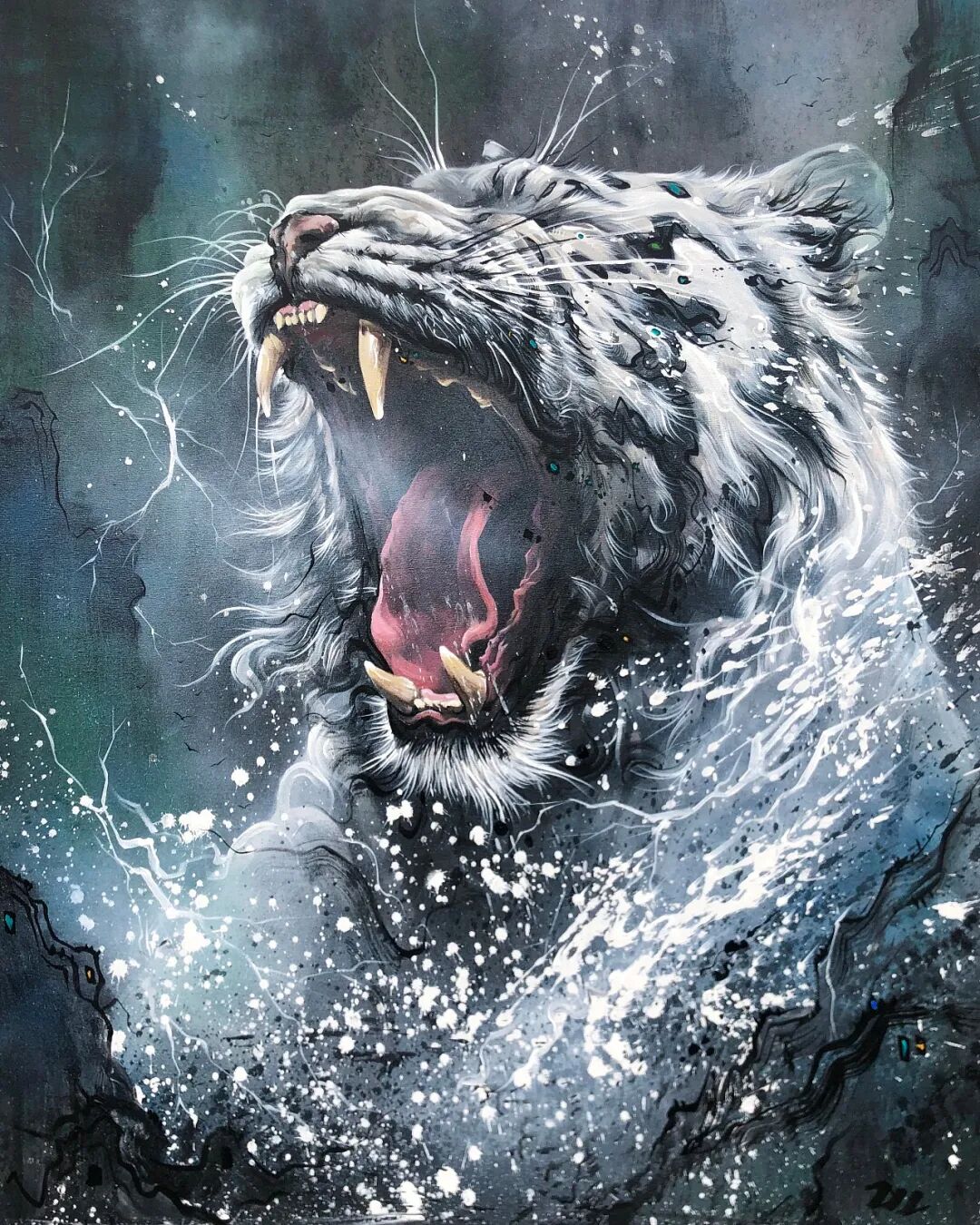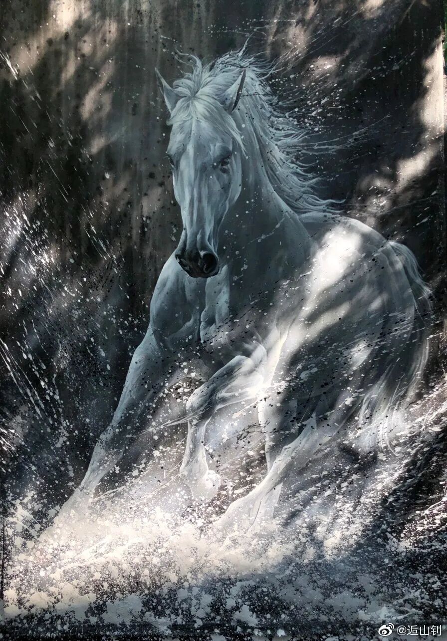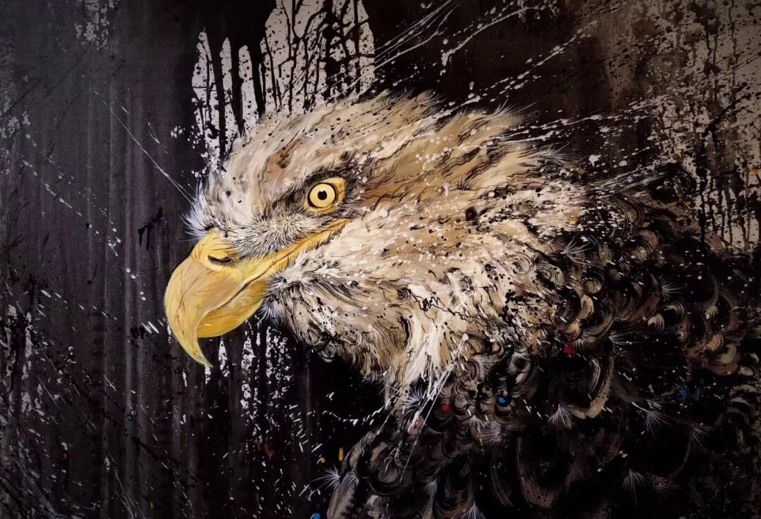 每次创作时他会先用泼墨技法