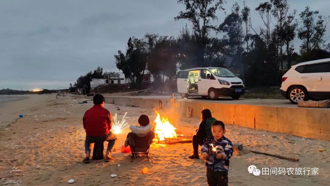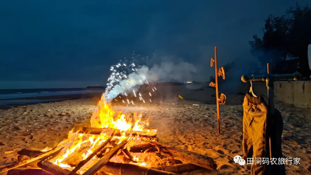 天色慢慢的暗下来了,看着于夜色海景风景,舍不得离开,于是便生起了篝火,顺手烘干了孩子白天穿湿的衣服。