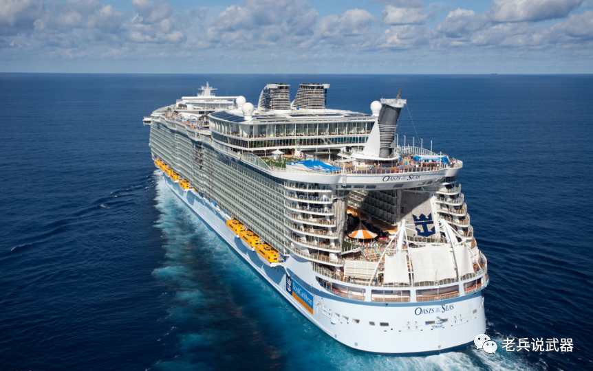 豪华邮轮的体积庞大,远远超出来一般的舰艇船只,甚至比有的航母个头还要大,世界上在海上营业的邮轮,小的排水量十几吨,大的甚至有几十吨重的,比如世界最大的豪华巨型邮轮,造价14亿美元的美国绿洲号邮轮。