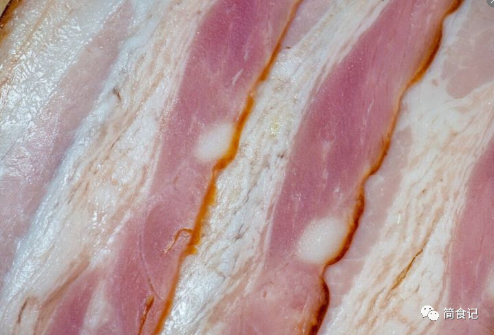 最后一点,看一下整片培根的构成,一般来说好的培根,都是层次分明的,肥瘦相间的。但是一些商家为了利益会用小碎肉,再加入各种添加剂,卡拉胶,粘合剂,把小碎肉粘合,就成了培根肉。选购时一定要注意。