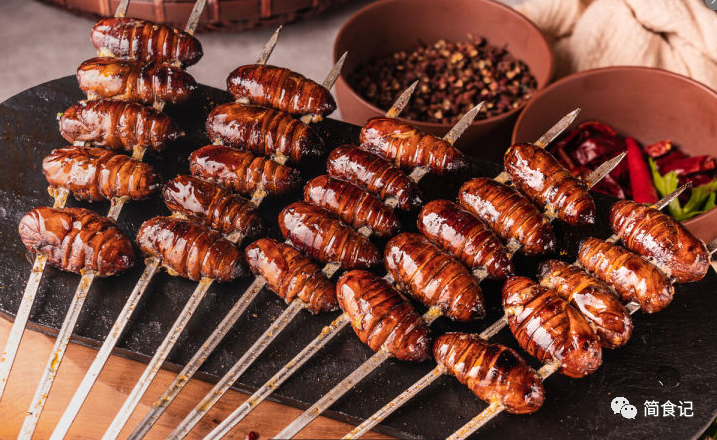 3:烤蚕蛹,这绝对是东北烧烤的霸主,虽然说很多地方都有烤蚕蛹的,但无论味道还是口感都远不及东北的。在东北烤蚕蛹的蚕蛹必须是活的,在蚕蛹还在扭动的时候拿签子将它串起来,然后再进行烤制。烤好的蚕蛹外焦里嫩,蚕蛹体内的蛋白质被凝结,轻轻咀嚼,焦香,料香,万千滋味在口腔中迸发,这感觉是其它烤串无法比拟的。如果东北人请你吃烤蚕蛹,那绝对是真爱。
