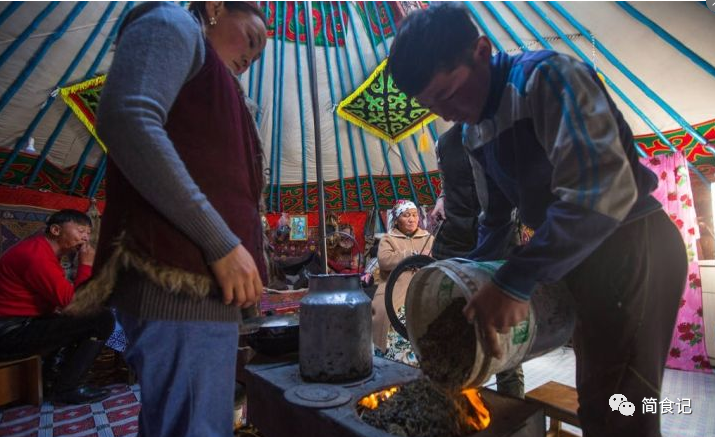 如果说家里有客人的话,必须安排上烤全羊。是的,就是整只羊经过腌制后,小火烤熟。几个人围坐一起,用刀割着吃。当然酒肯定是少不了的。除了羊肉还有自制的牛肉干,奶皮子等等。