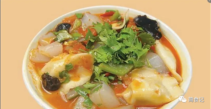 汤粉饺子,在当地又称为“皮条拉石头”。饺子馅主要是用猪肉,或者羊肉,配菜用白菜或者萝卜,采用传统方法制作而成。出锅时再佐以生葱,盐,醋,油辣子,味精等调料。滋味酸辣可口,又有发热驱寒的效果,特别适合寒冷地区的人食用。