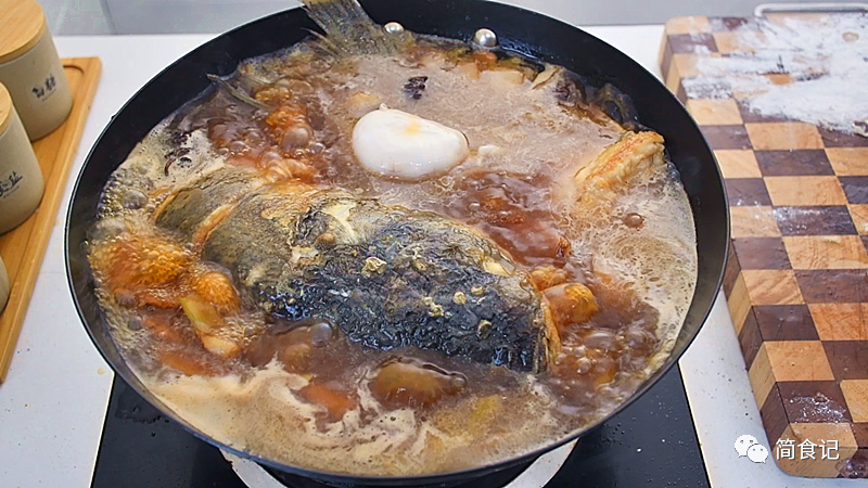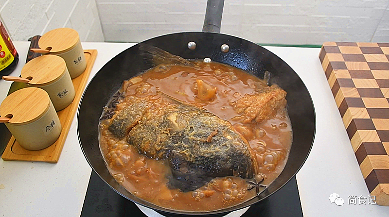 4:然后加盐,鸡粉,白糖调味,少许老抽调色。随后放入煎好的胖头鱼,烧沸后转小火炖煮40分钟。注意一点,水量要没过鱼身。炖煮时要随时观看,晃动锅子,以免糊底。