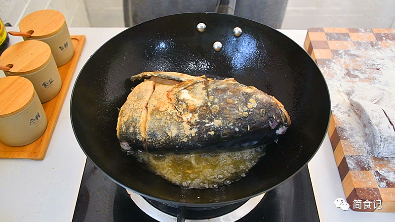 2::全都处理完之后,在鱼身均匀地拍上一层面粉。要用面粉,千万不要用淀粉。然后将其放入热油锅中煎制,全程保持中火状态,将鱼头和鱼尾煎至两面金黄,去除待用。