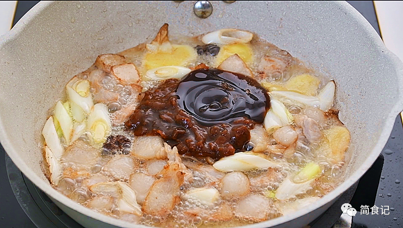 3:炒锅加油烧热,放入猪肉炒出油脂,随后加入八角,葱姜片炒香。再加入黄豆酱,蚝油,生抽,料酒炒出酱香味,随后加入清水烧沸。
