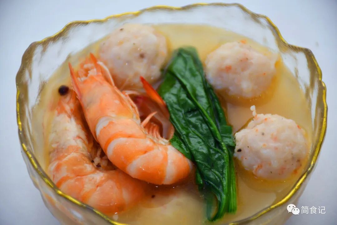 5:煮好的虾丸装入大碗,然后放入大虾。随后将炒锅内汤汁调味,加盐,胡椒粉调味。烧沸后浇在盛有大虾和虾丸的碗中。放点小青菜点缀一下,就可以了。