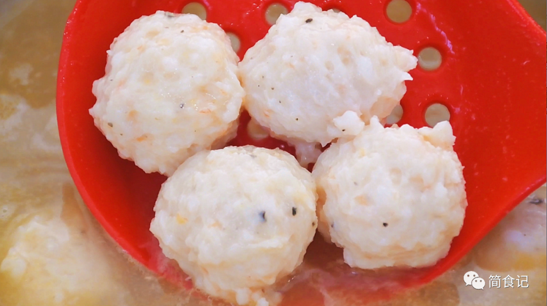 4:取出虾头之后,将调好的虾泥做成丸子形状下入锅中,煮至捞起后捞出装盘。随后再放入两个大虾煮熟。