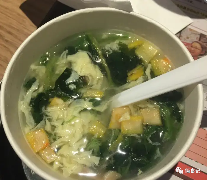 4:芙蓉鲜蔬汤,这个也挺坑的,刚开始还以为是新鲜蔬菜做的汤,但尝过后才发现,比想象中的差远了,不仅味道一般般,而且看着也不像是新鲜蔬菜制作的。完全就是热水泡蔬菜干,性价比非常低,喝起来也没有什么味道。还不如我们中餐的西红柿鸡蛋汤,三鲜汤有滋有味呢。再就是价格也比较贵,一小碗要卖10块钱,着实不太实惠。