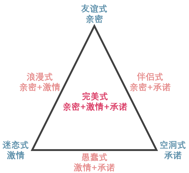 斯滕伯格的爱情三角理论认为爱情是由亲密、激情和承诺三大要素构成的: