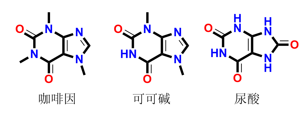 咖啡因、可可碱、尿酸化学结构(作者绘制)