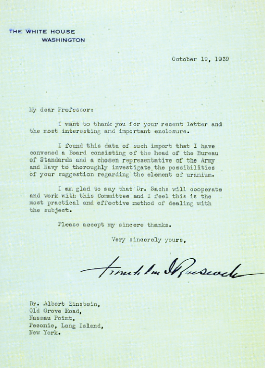 罗斯福总统对爱因斯坦-西拉德信的回信。图片来源:Wikipedia