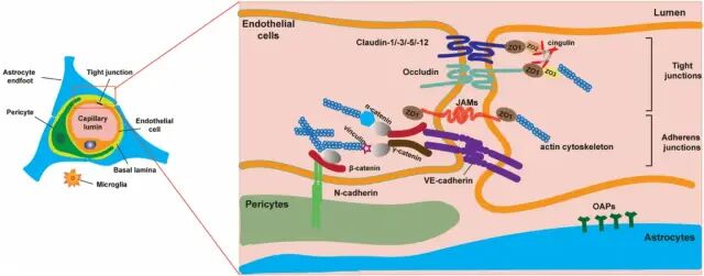 血液流经我们身体各处,以毛细血管的形式与组织细胞相接触,并且释放氧气,带走二氧化碳,释放营养物质,带走代谢废物。脑部或脊柱处也存在毛细血管,但这些毛细血管被层层细胞包裹,里面的物质想要释放出来进入脑组织还真不容易。毛细血管壁是一层内皮细胞,接着是一层周细胞,再接着是基底层,然后才是脑细胞即星形胶质细胞。除了层层包裹,脑毛细血管还比身体其他位置的毛细血管审查机制更严格,允许放行的大小分子更有限。这两个方面共同构成了血脑屏障的概念。正是因为血脑屏障的出现,才使得中枢神经系统不会轻易的被外源毒素、药物等伤害,又能保证必须的养分供应,保持大脑功能正常。