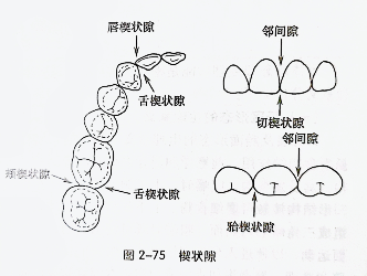 牙齿邻面的分离区域可以构成上、下、内、外四个方向的间隙:上方为切/楔状隙,下方为邻间隙(其间充满牙龈的牙间乳头部分,此处也是牙菌斑、牙结石容易堆积的部分,更是牙齿邻面清洁的重点目标区域),内侧为舌楔状隙,外侧为唇/颊楔状隙。