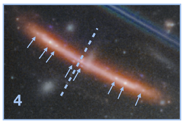 图3的区域很小,但是如果放大了看,能看到星系周围散落着一些珍珠般的小亮点。这些珍珠其实是在宇宙更早期的星系中诞生的一系列年轻的星团。