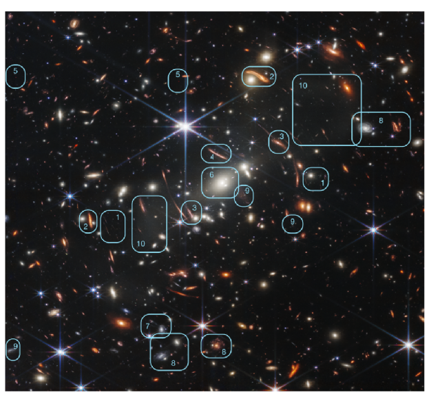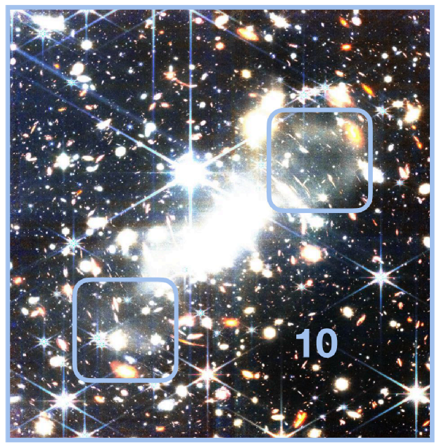 你或许听说过,根据广义相对论,引力能弯曲光线。在“小暑上天图”的中间部分,正是SMACS 0723.3-7327星系团的中心区域。星系团巨大质量带来的显著引力效应使部分途径此地并且射向我们的电磁波偏转,造就了这些浅浅的弧线。
