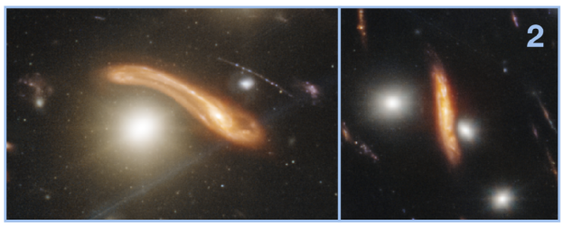 前面提到的暗物质的引力透镜效应能将背景星系塑造成各种独特的造型。图2左面这个被扭曲的旋涡星系,看起来就很像是达利名作《融化的时钟》里的那台扭曲的钟。