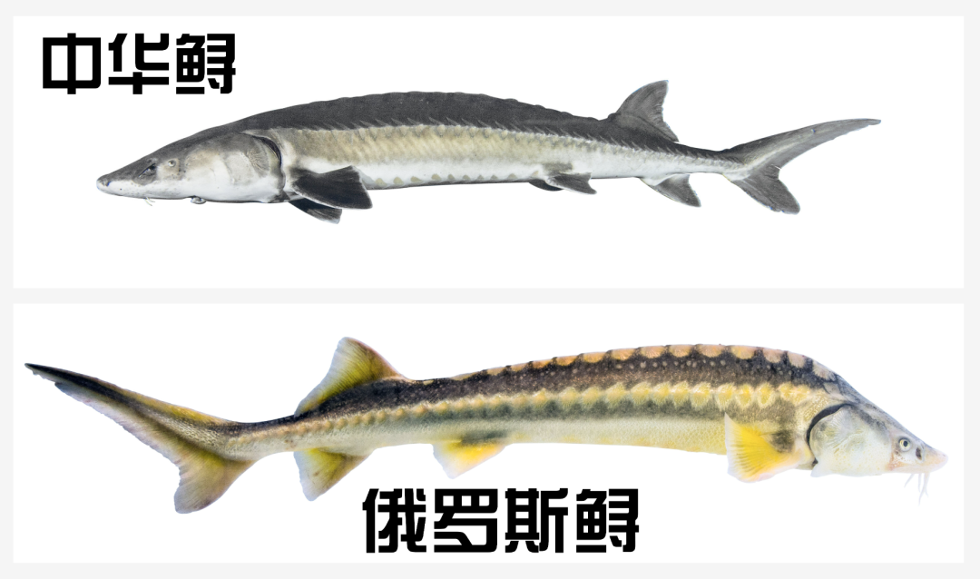 比如说中华鲟和俄罗斯鲟,从体型特征判断:俄罗斯鲟的尾鳍上下叶差距比较大,上叶要远远长于下叶。而中华鲟尾鳍的上叶仅仅是稍微比下叶长。