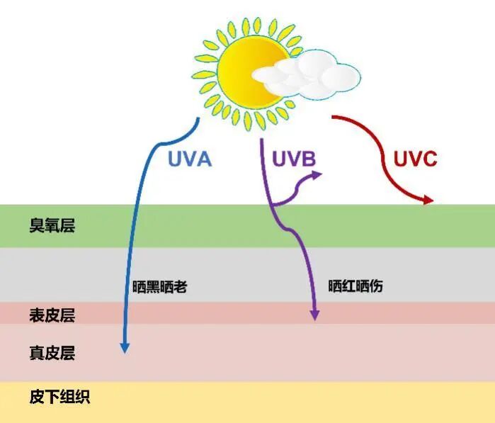 紫外线又可细分为长波长的UVA、中波长的UVB和短波长的UVC。其中,UVC则一般会被臭氧层阻隔,不能到达地球表面。UVB虽能促进体内矿物质代谢和维生素D的形成,但长期或过量照射会造成皮肤红、肿、热、痛,严重者还会起水泡或脱皮,我们平常说的晒伤就是由UVB引起。