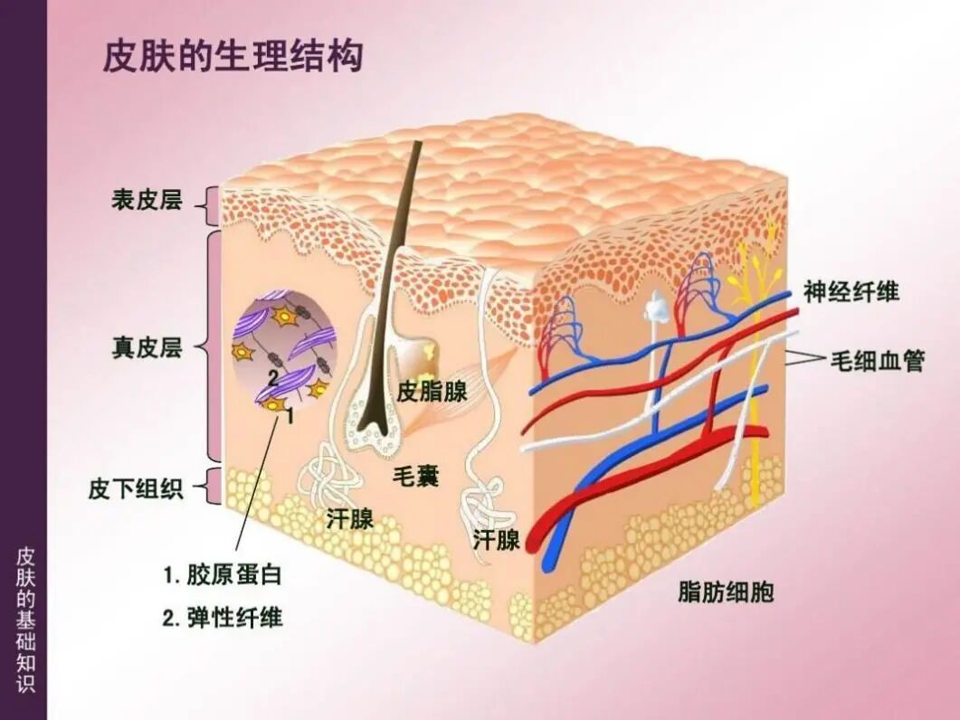 这要从我们皮肤的结构说起,我们的皮肤可以分为表皮层、真皮层以及皮下组织。其中表皮层是皮肤最外面的一层,平均厚度只有0.2毫米,是人体的保护屏障。