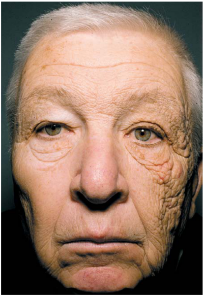 光老化的可怕在于它的不可逆性。《新英格兰医学杂志》曾刊登过一个案例:一名有28年驾龄的卡车司机,因为左脸靠近车窗会接受到更多阳光照射,长年累月下来,左半边脸明显皱纹更多,皮肤增厚且更加松弛,与右脸相比老化状况更加严重。