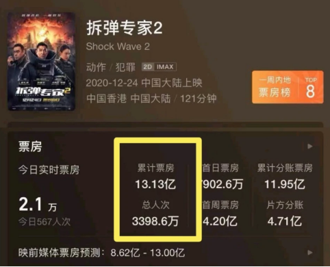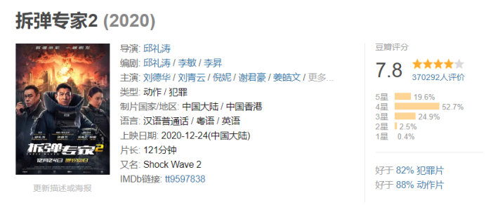 豆瓣评分7.8,票房13亿,超过88%的动作片,这就是《拆弹2》交出的答卷。除此之外,低排片、口碑逆袭、当年港片最佳,是网友给这部电影贴出的标签
