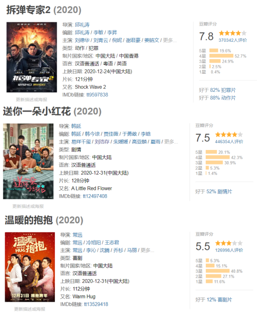在《送你一朵小红花》与《温暖的抱抱》双重夹击下,《拆弹2》的排片只能屈居第三,这反而让广大网友为之感到不平。因为《拆弹2》的口碑最好,评分最高。照理说,《拆弹2》才是同档期中最优秀的电影,排片却只有第2名《温暖的抱抱》的一半左右。