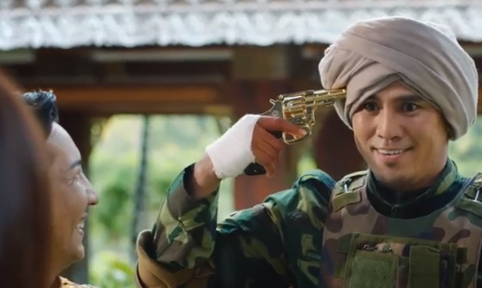 第三处是身份被拆穿后,杀手跟叶明珠左轮赌命的情景。这个情节把紧张感和搞笑元素融合到了一起,杀手的表演可圈可点,特别具有喜感。