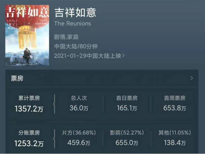 《吉祥如意》是大鹏以自己老家的真人真事为原型,以仿纪录片的手法拍摄的一部家庭片。相比《煎饼侠》票房11.6亿,《缝纫机乐队》票房4.59亿,《吉祥如意》的票房只有一千三百多万。