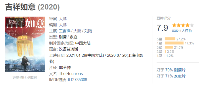 票房成绩不能完全代表电影的品质,《吉祥如意》7.9的豆瓣评分是目前大鹏执导电影中最亮眼的。