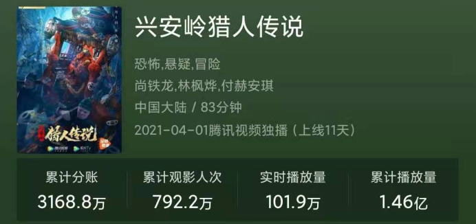 截止到4月11为止,上映11天的《兴安岭猎人传说》累积分账三千多万,观影人次接近八百万。这个成绩,在网大电影中无疑是相当优秀。