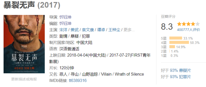 《心迷宫》的成功并未限制住忻钰坤的脚步。2017年,他带着同是悬疑片,却不同叙事手法的《暴裂无声》归来。虽然评分比《心迷宫》略低,但8.3的分数无疑说明这同样是一部佳作。