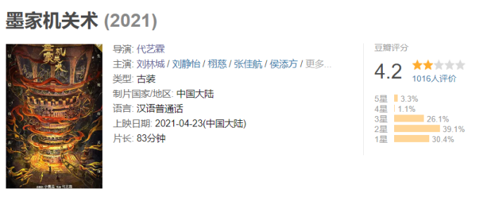 看完《墨家机关术》,我深刻的感受到什么叫做智商被侮辱。导演的不用心,演员的不专业,剧情的敷衍,网友给出4.2的评分,一点都不冤,甚至还有些高了。