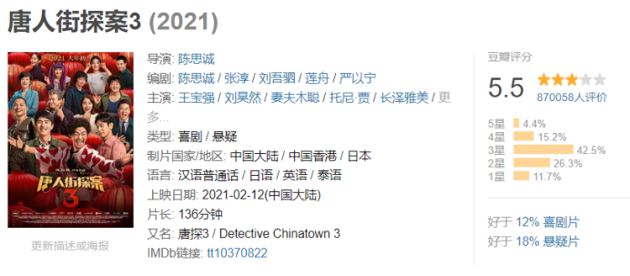 照我们一般理解,电影的票房跟口碑应该成正比。但是不管从电影质量还是口碑来看,《唐探》系列都不能算是优秀。