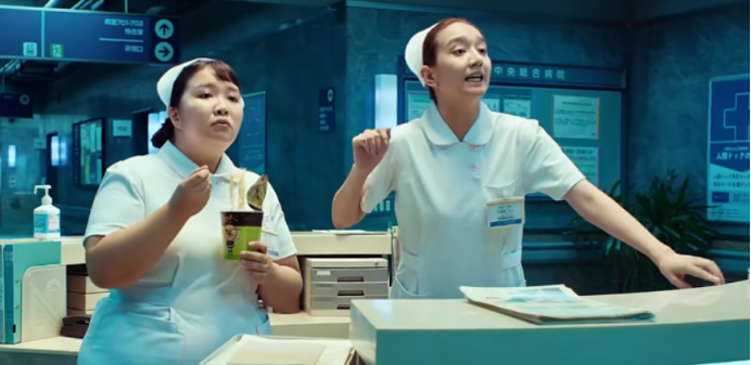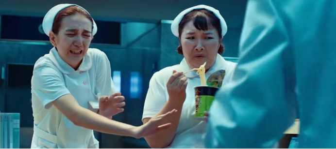 在前台,设置了一胖一瘦两名护士。瘦护士边看僵尸片边吃泡面。