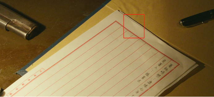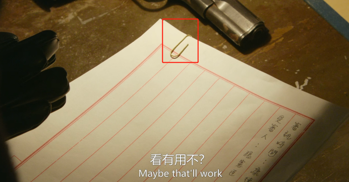 一个是敌方特务长官高彬与周乙一起进到审讯室时,周乙拿起审讯资料查看,此时是有回形针的。