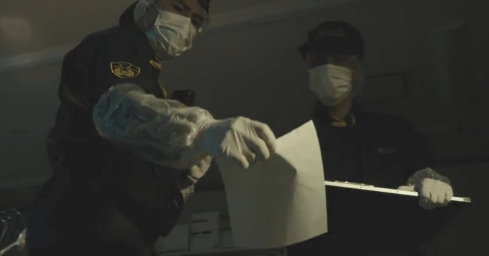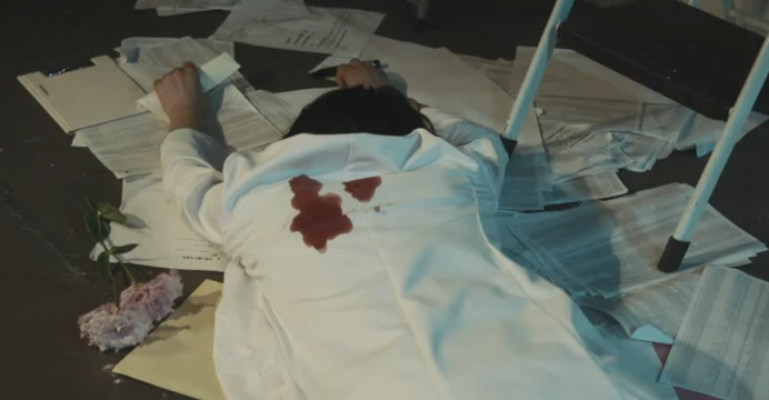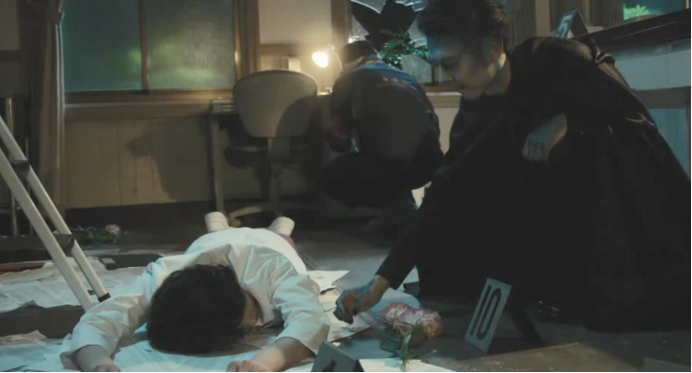 随后三上惠在桌上写下凶手的名字,并将桌上的花瓶打碎,做完这些后把手里的记号笔扔到远处。