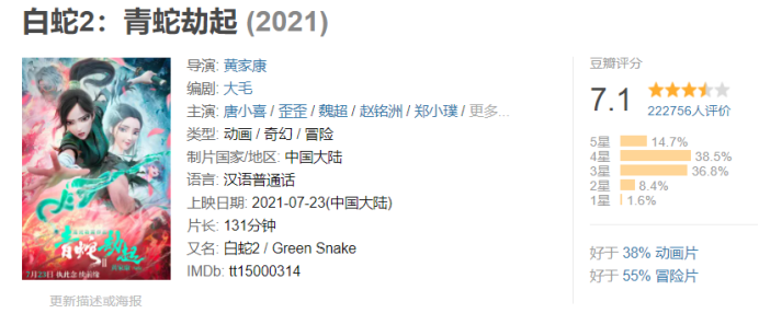 从剧情上来说,《白蛇2:青蛇劫起》十分大胆的放弃了白蛇与许仙的爱情线,转而去讲述白蛇与青蛇之间的姐妹情深。再搭配对女性思想觉醒的思考,整体质量水平要超过大部分院线电影,22万人给出7.1的评分,也证明了市场的认可度。