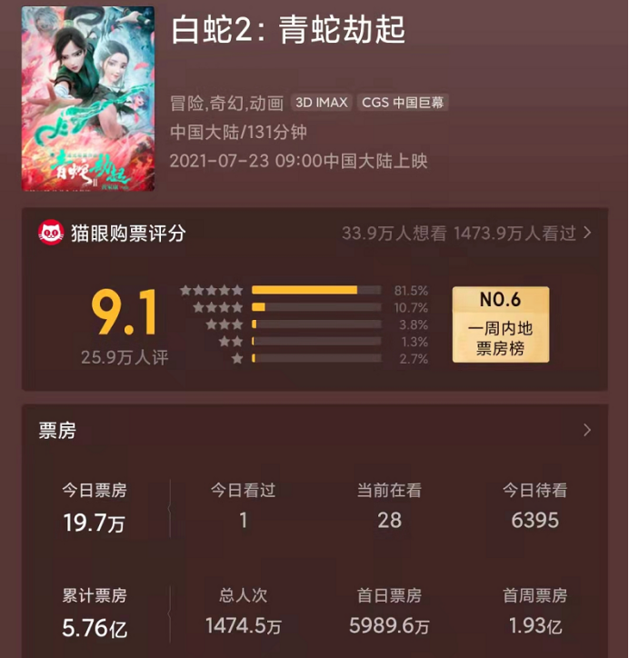今年,《白蛇2:青蛇劫起》上映,以了5.76亿的票房成绩超越了《白蛇:缘起》。