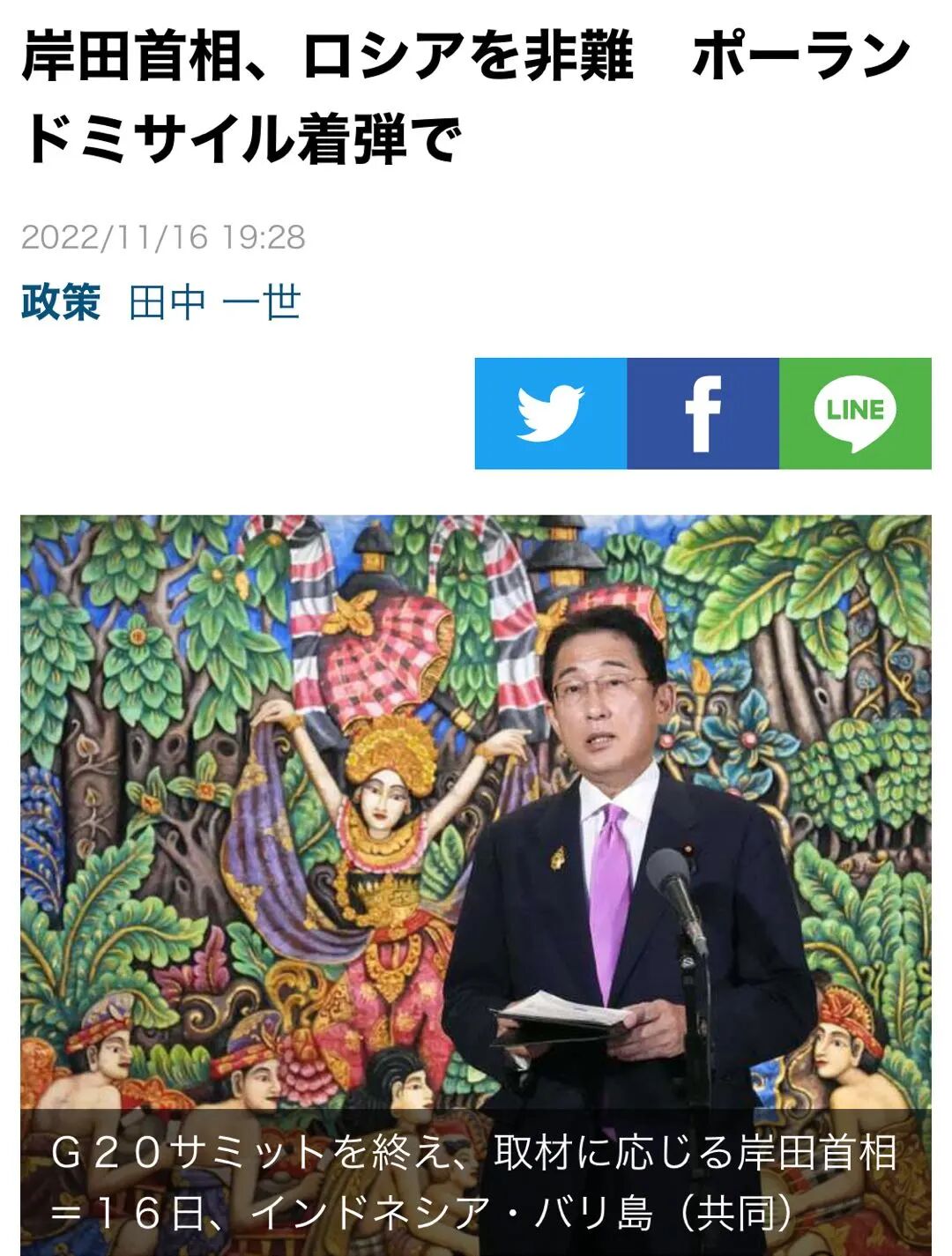 毕竟,日本人不满自家首相在国际大事上缺少存在感已久。岸田一放话,日本国内新闻通稿紧跟着上了:《岸田首相、因导弹打到波兰、指责俄罗斯》。