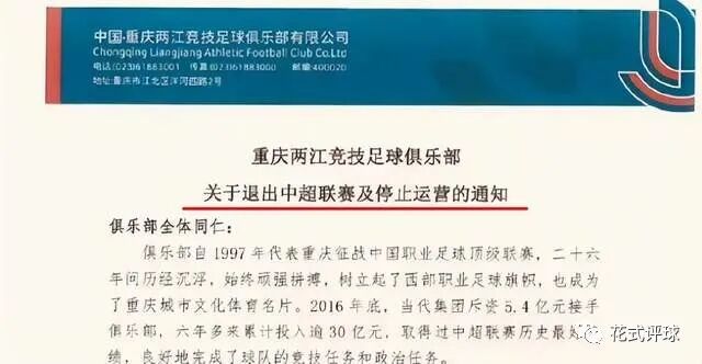 最新消息:重庆两江竞技官宣退出中超,俱乐部停止运营。