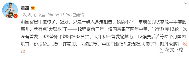 这不,洛国富打进巴甲第二球后,董路被迫在个人社交平台上连续发2篇动态进行回应。